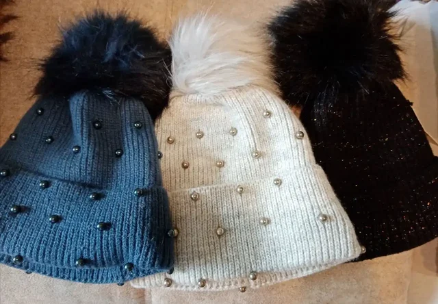 Женские теплые шапки с бубоном и бусинками